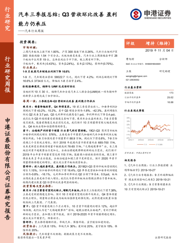 【申港证券】【20191104】20191104-申港证券-汽车行业周报:汽车三季报总结:Q3营收环比改善 盈利能力仍承压-35页