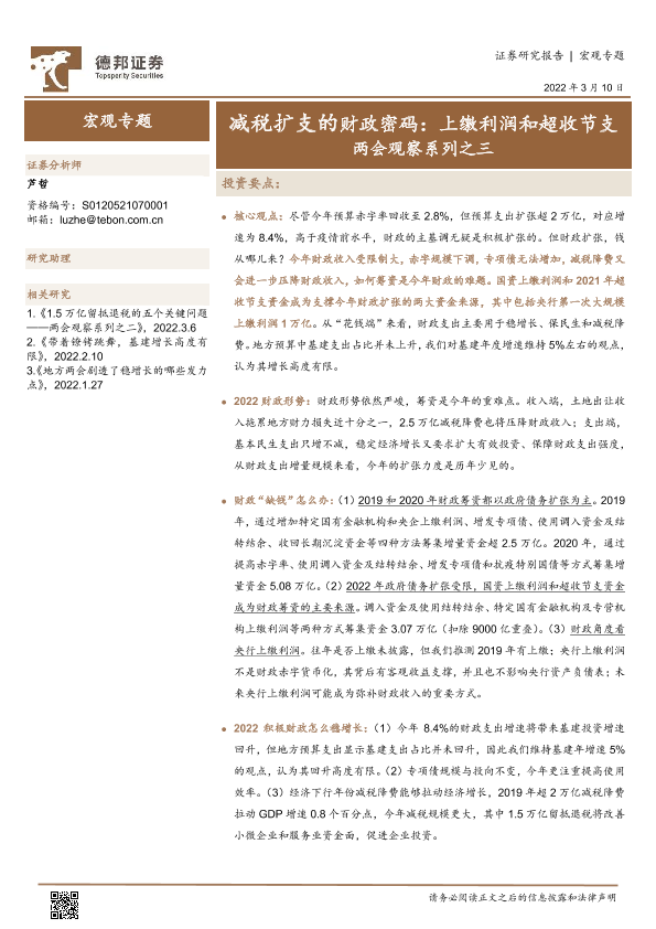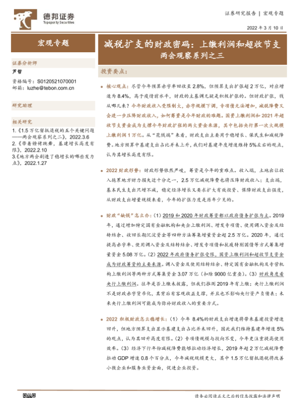 【德邦证券】【20220310】两会观察系列之三:减税扩支的财政密码,上缴利润和超收节支-17页