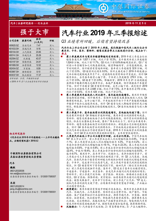 三季报 业绩回暖 投资建议 汽车行业 销量分析