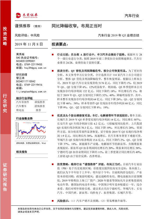 Q3业绩 东莞证券 布局建议 汽车行业 财务分析