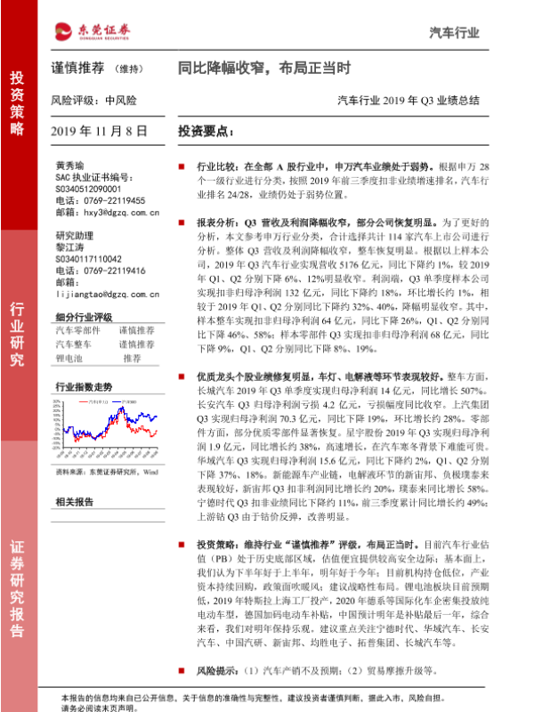 【东莞证券】【20191108】汽车行业2019年Q3业绩总结:同比降幅收窄,布局正当时-10页
