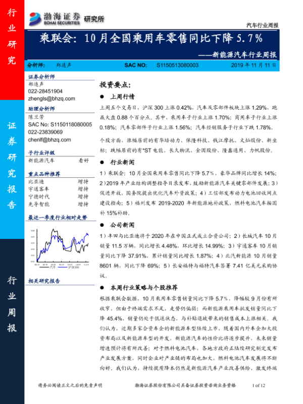 【渤海证券】【20191111】20191111-渤海证券-新能源汽车行业周报:乘联会:10月全国乘用车零售同比下降5.7%-12页