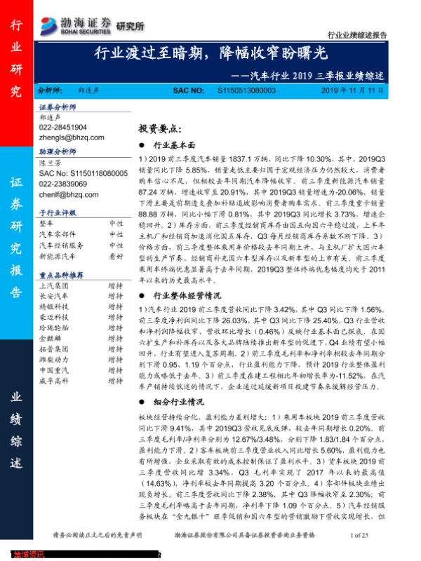 【渤海证券】【20191111】汽车行业2019三季报业绩综述:行业渡过至暗期,降幅收窄盼曙光-25页