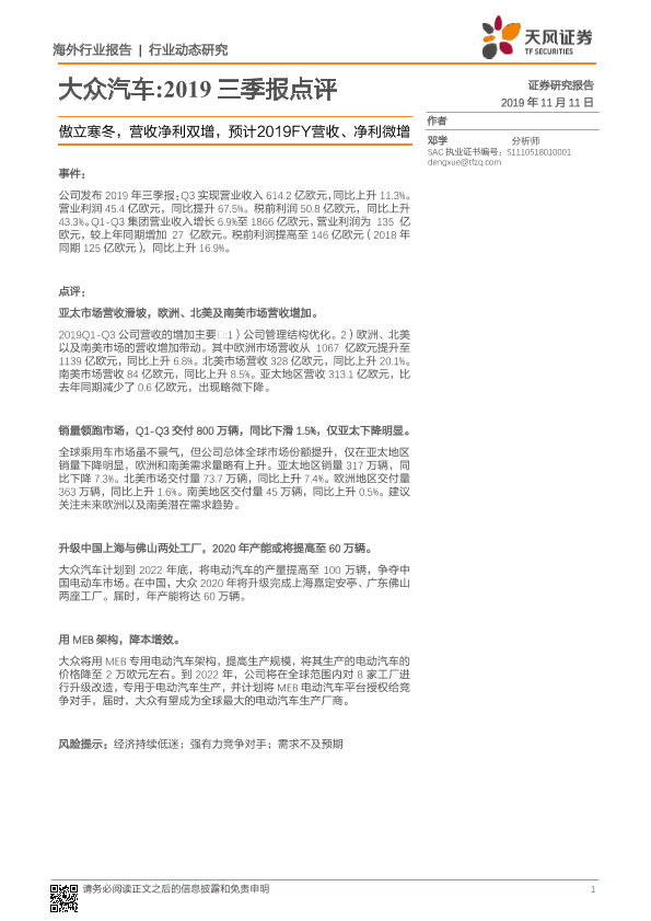 【天风证券】【20191111】大众汽车:2019三季报点评:傲立寒冬,营收净利双增,预计2019FY营收、净利微增-4页