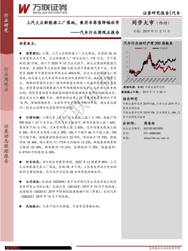 【万联证券】【20191111】20191111-万联证券-汽车行业周观点报告:上汽大众新能源工厂落地,乘用车零售降幅收窄-13页