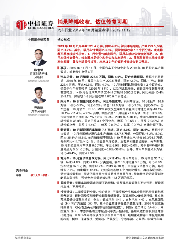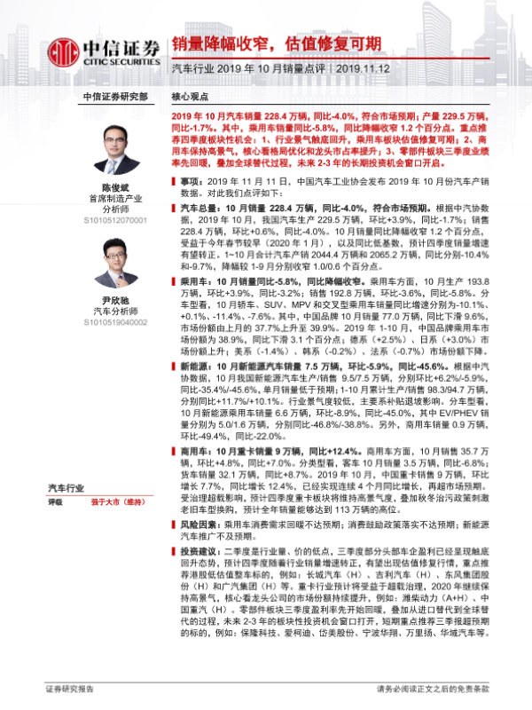 【中信证券】【20191112】汽车行业2019年10月销量点评:销量降幅收窄,估值修复可期-2页