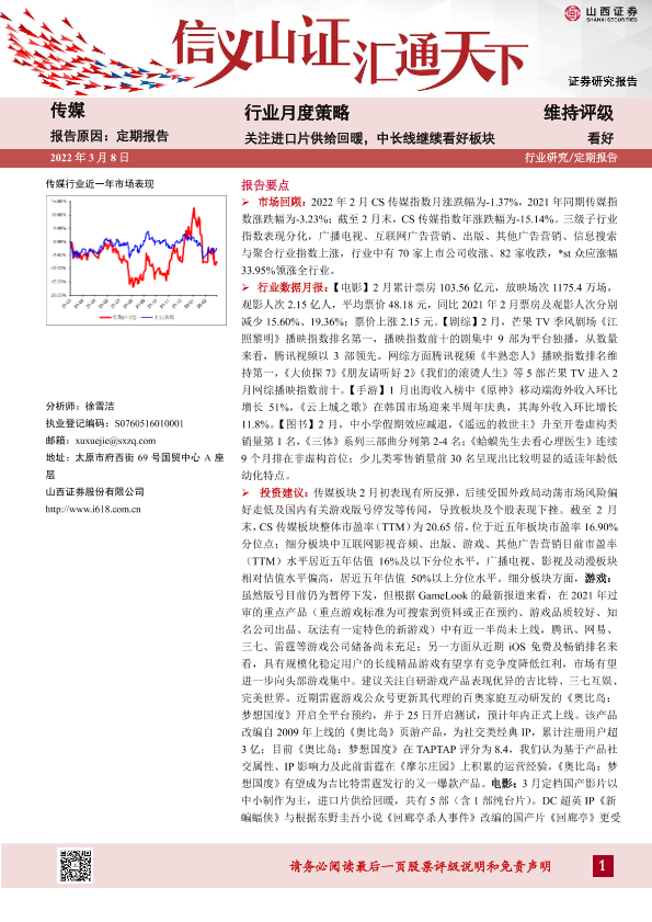 【山西证券】【20220308】传媒行业月度策略:关注进口片供给回暖,中长线继续看好板块-24页