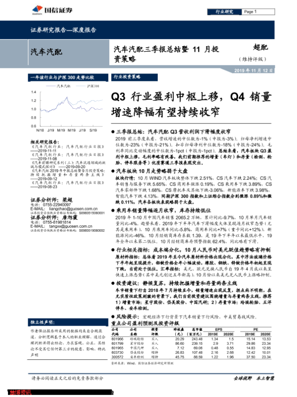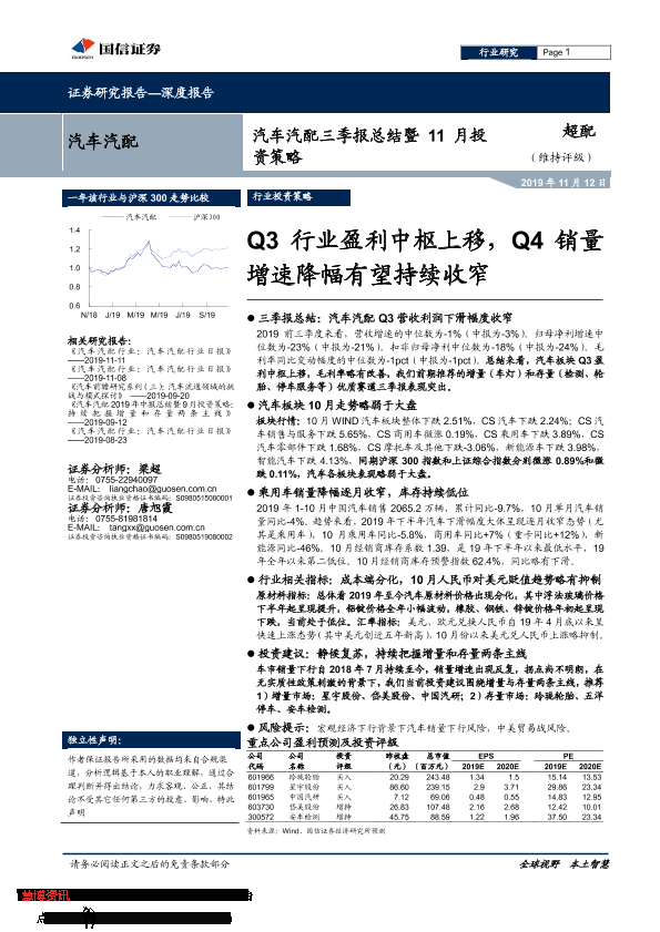 【国信证券】【20191112】汽车汽配行业三季报总结暨11月投资策略:Q3行业盈利中枢上移,Q4销量增速降幅有望持续收窄-28页