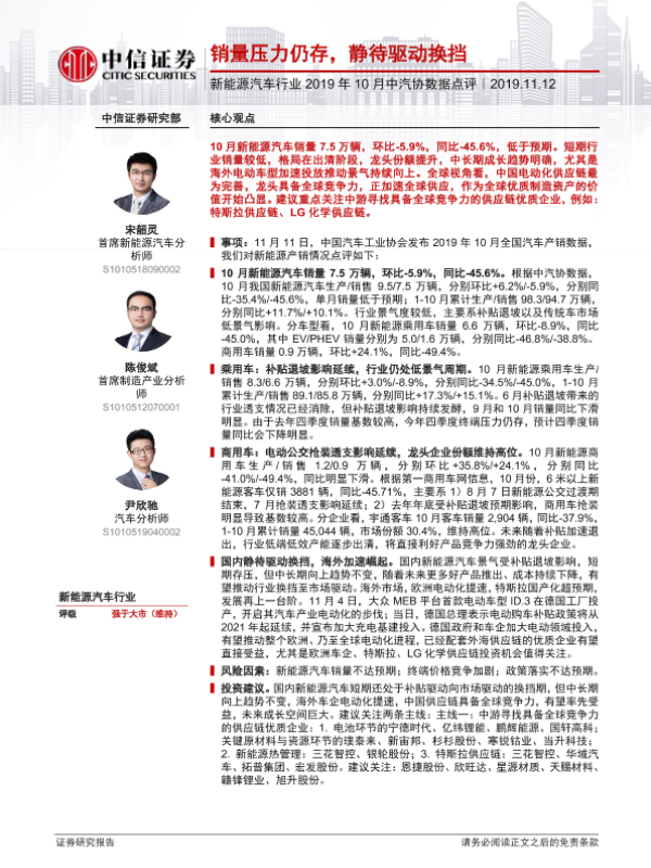 【中信证券】【20191112】新能源汽车行业2019年10月中汽协数据点评:销量压力仍存,静待驱动换挡-2页
