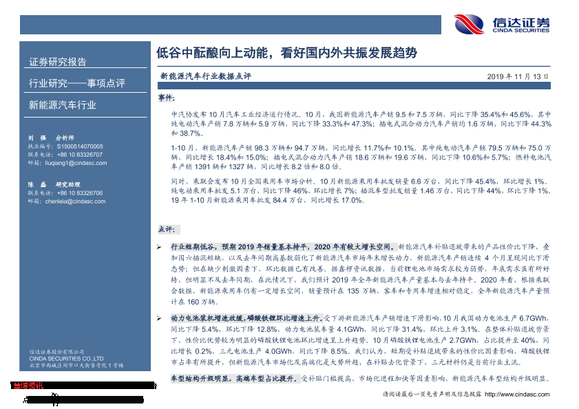 【信达证券】【20191113】新能源汽车行业数据点评:低谷中酝酿向上动能,看好国内外共振发展趋势-6页