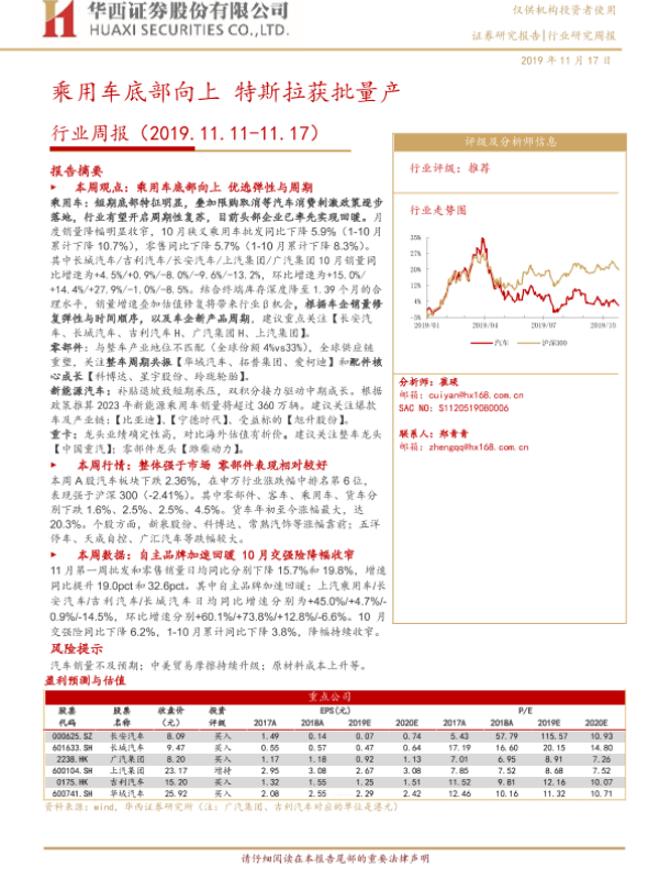 【华西证券】【20191117】20191117-华西证券-汽车行业周报:乘用车底部向上 特斯拉获批量产-20页