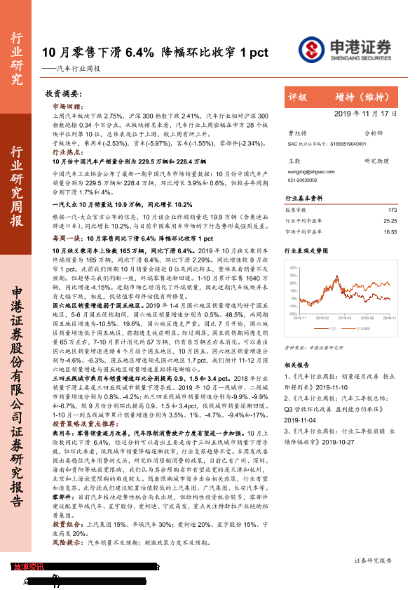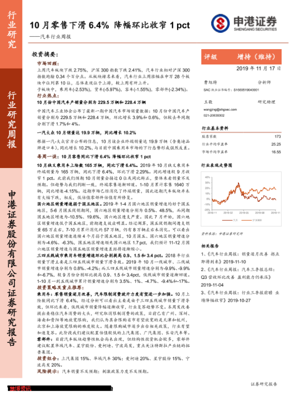 【申港证券】【20191117】20191117-申港证券-汽车行业周报:10月零售下滑6.4%降幅环比收窄1pct-20页