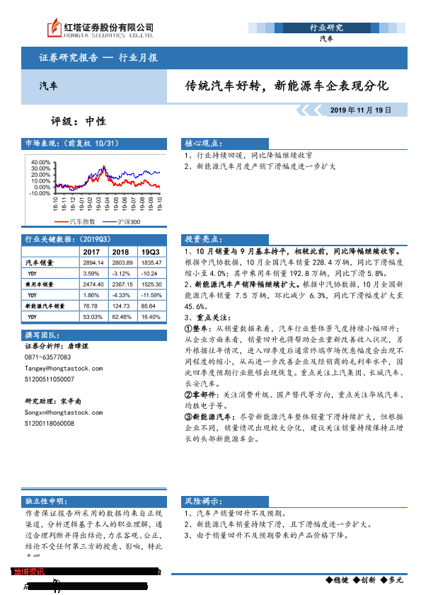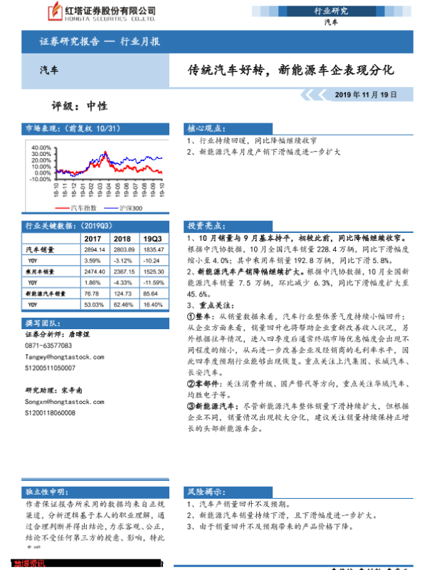 【红塔证券】【20191119】20191119-红塔证券-汽车行业月报:传统汽车好转,新能源车企表现分化-16页