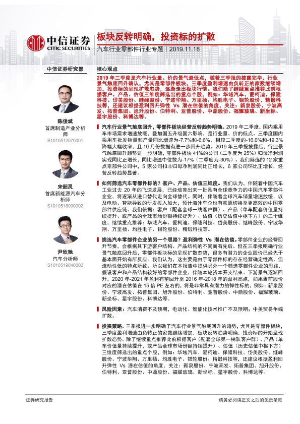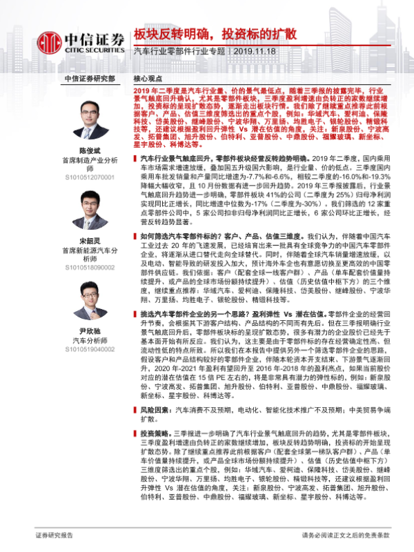 【中信证券】【20191118】汽车行业零部件行业专题:板块反转明确,投资标的扩散-20页