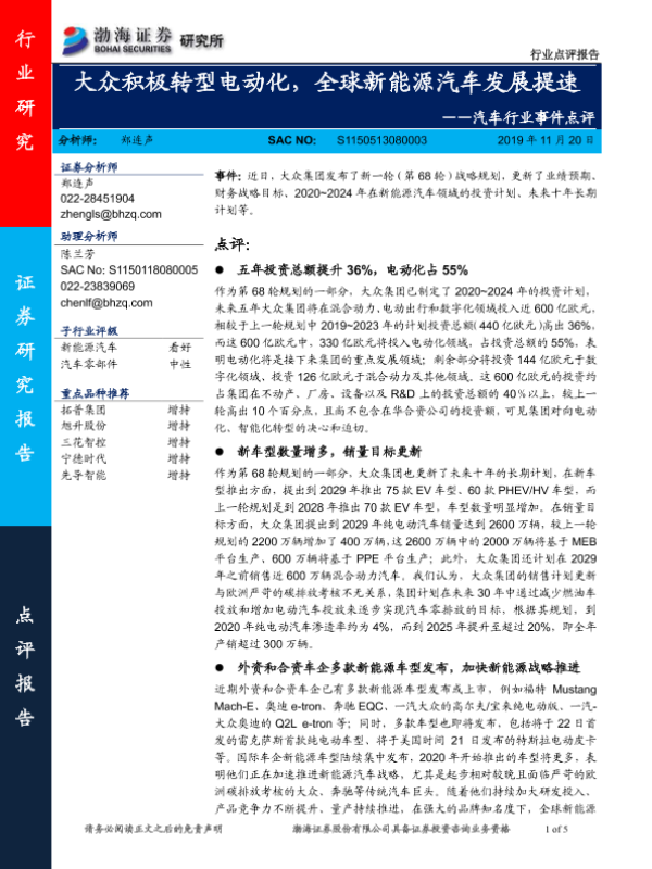 【渤海证券】【20191120】汽车行业事件点评:大众积极转型电动化,全球新能源汽车发展提速-5页