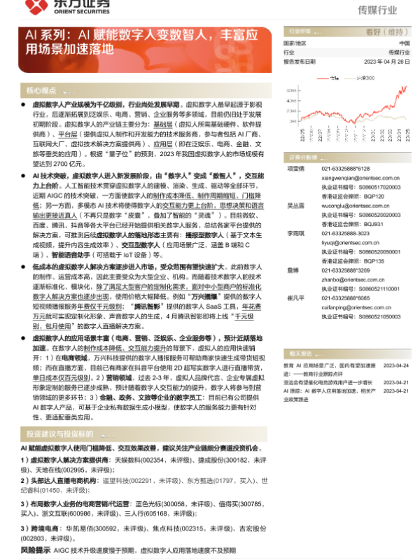 【东方证券】【20230428】传媒行业深度报告-AI系列-AI赋能数字人变数智人-丰富应用场景加速落地-23页
