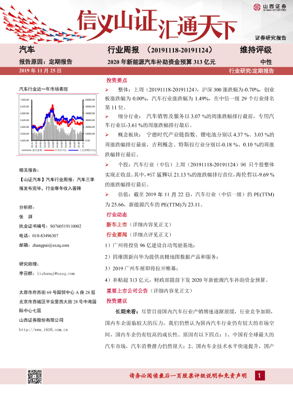 【山西证券】【20191125】20191125-山西证券-汽车行业周报:2020年新能源汽车补助资金预算313亿元-14页