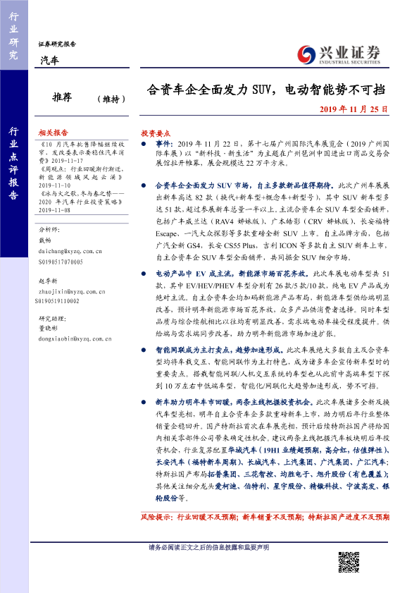 【兴业证券】【20191125】20191125-兴业证券-汽车行业点评报告:合资车企全面发力SUV,电动智能势不可挡-4页