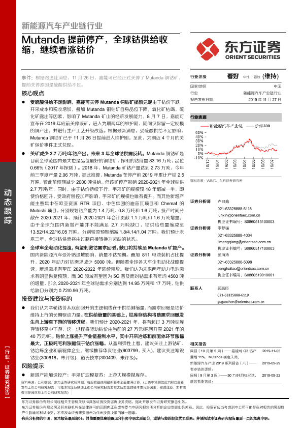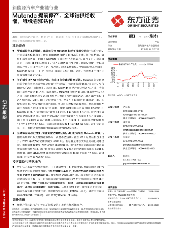 【东方证券】【20191127】Mutanda提前停产,全球钴供给收缩,继续看涨钴价-3页