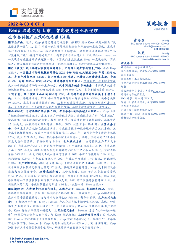 【安信证券】【20220307】全市场科技产业策略报告第131期:Keep拟港交所上市,智能健身行业再梳理-33页