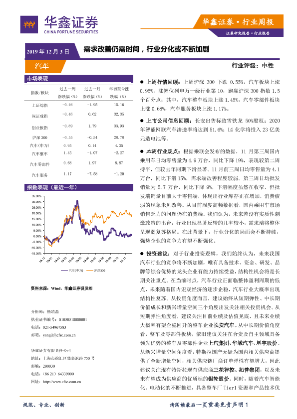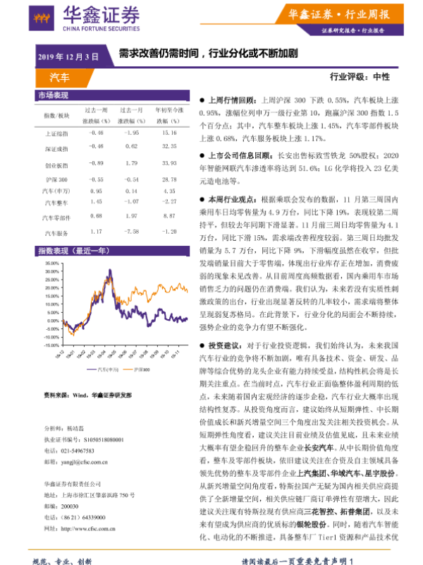 【华鑫证券】【20191203】20191203-华鑫证券-汽车行业周报:需求改善仍需时间,行业分化或不断加剧-18页
