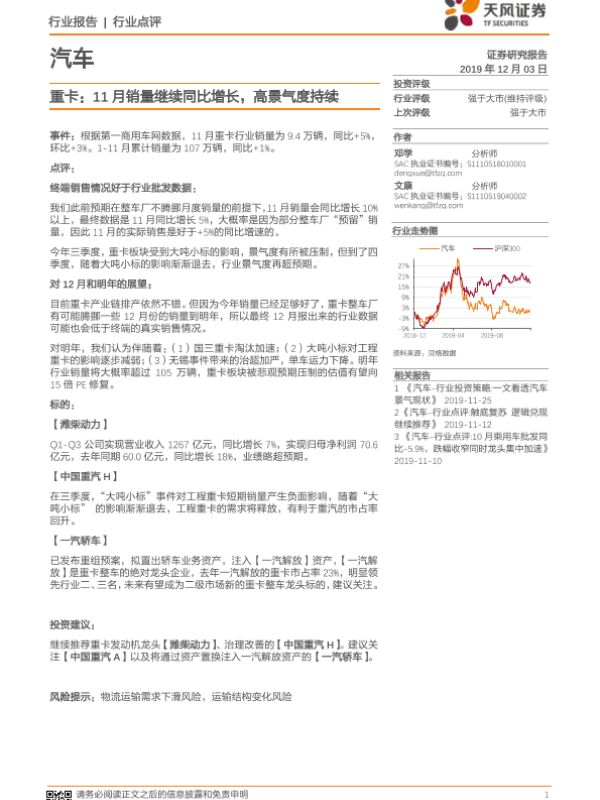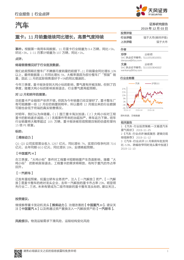【天风证券】【20191203】汽车:重卡:11月销量继续同比增长,高景气度持续-9页