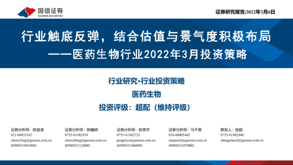 【国信证券】【20220306】医药生物行业2022年3月投资策略:行业触底反弹,结合估值与景气度积极布局-34页