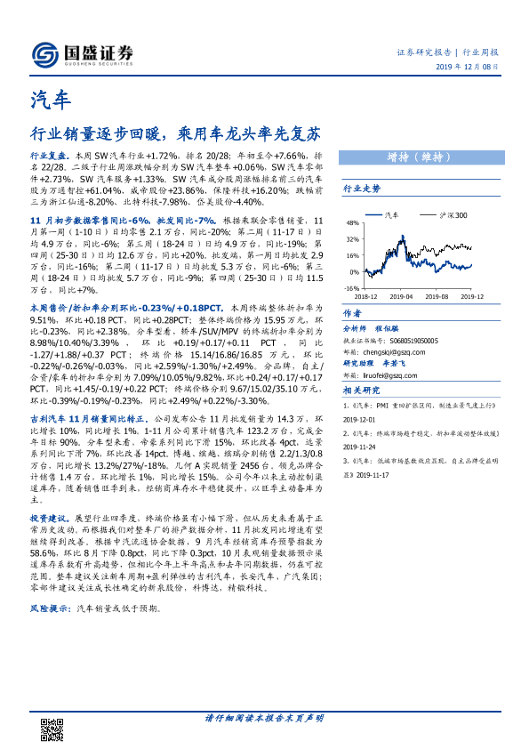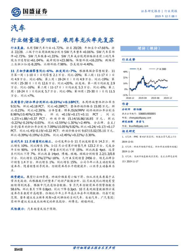 【国盛证券】【20191208】20191208-国盛证券-汽车行业周报:行业销量逐步回暖,乘用车龙头率先复苏-16页