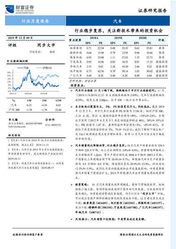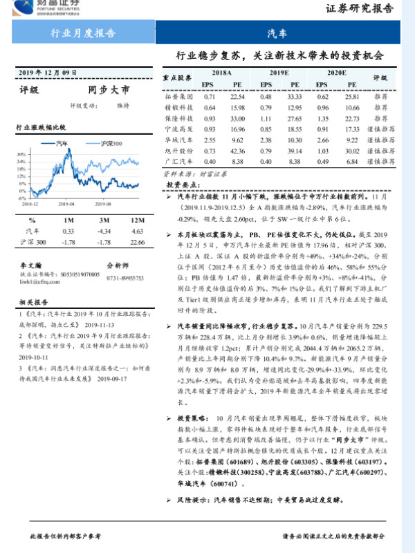【财信证券】【20191209】汽车行业月度报告:行业稳步复苏,关注新技术带来的投资机会-13页