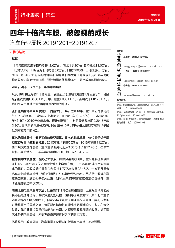 【西部证券】【20191208】20191208-西部证券-汽车行业周报:四年十倍汽车股,被忽视的成长-21页