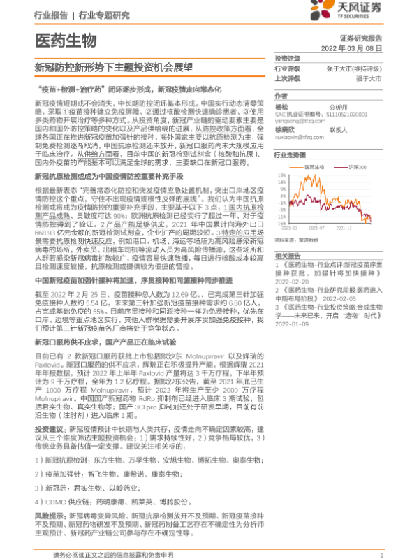 【天风证券】【20220308】医药生物行业:新冠防控新形势下主题投资机会展望-18页