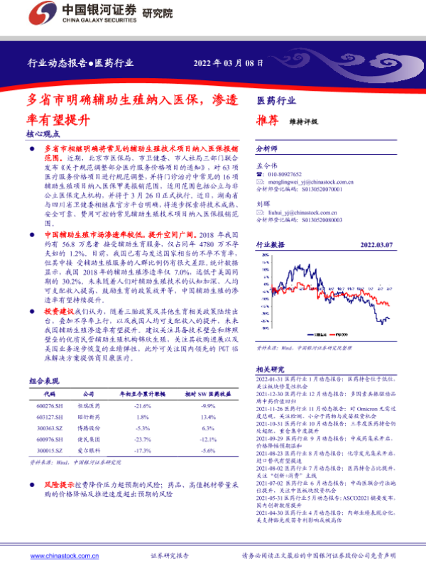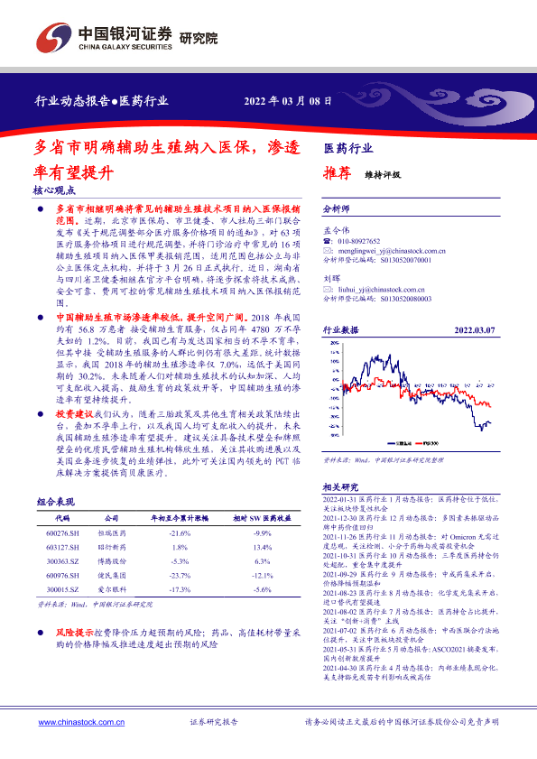 【银河证券】【20220308】多省市明确辅助生殖纳入医保,渗透率有望提升-22页