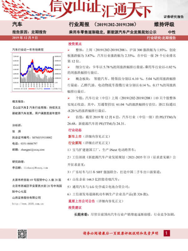 【山西证券】【20191209】20191209-山西证券-汽车行业周报:乘用车零售逐渐稳定,新能源汽车产业发展规划公示-15页