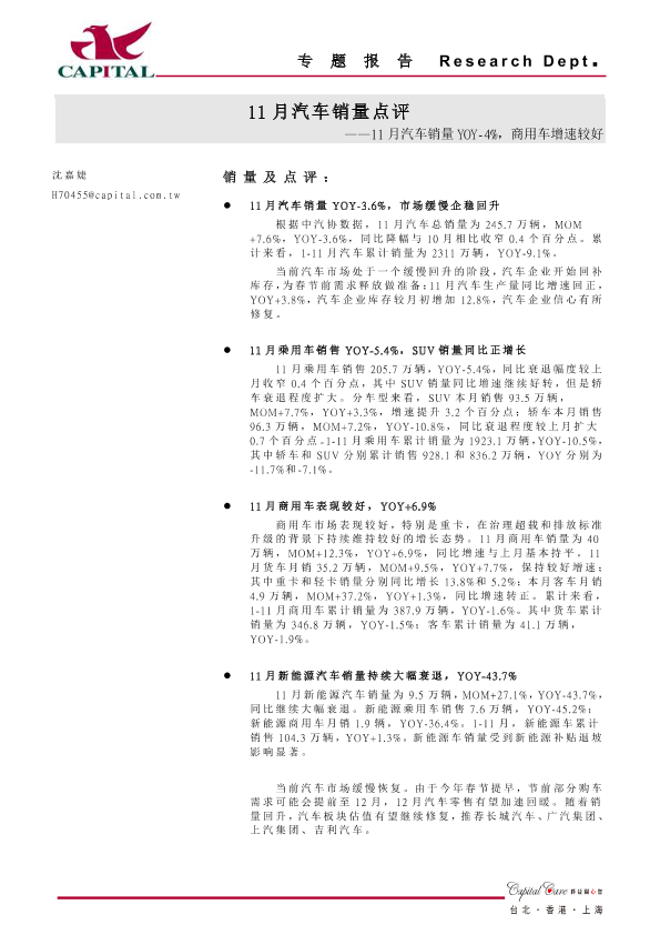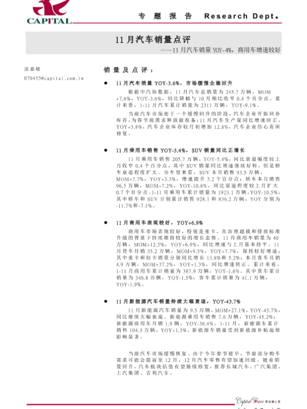 【群益证券】【20191211】11月汽车销量点评:11月汽车销量YOY-4%,商用车增速较好-3页