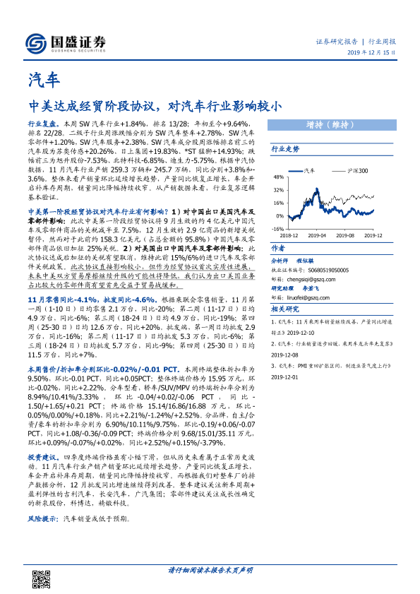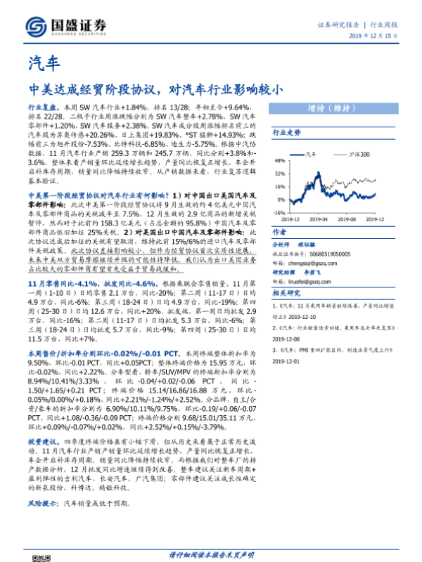 【国盛证券】【20191215】20191215-国盛证券-汽车行业周报:中美达成经贸阶段协议,对汽车行业影响较小-17页