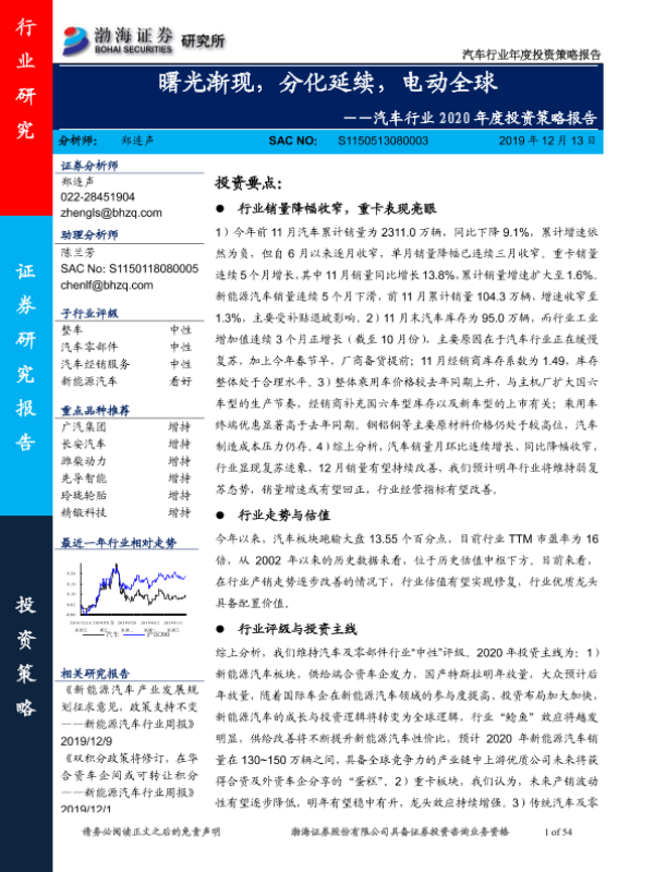 【渤海证券】【20191213】20191213-渤海证券-汽车行业2020年度投资策略报告:曙光渐现,分化延续,电动全球-54页