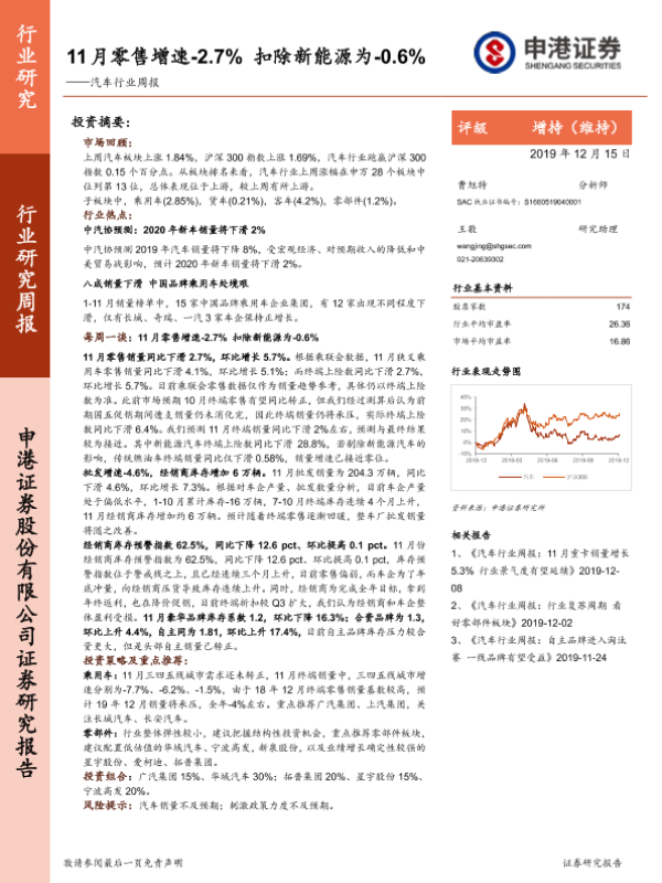 【申港证券】【20191215】20191215-申港证券-汽车行业周报:11月零售增速-2.7% 扣除新能源为-0.6%-24页