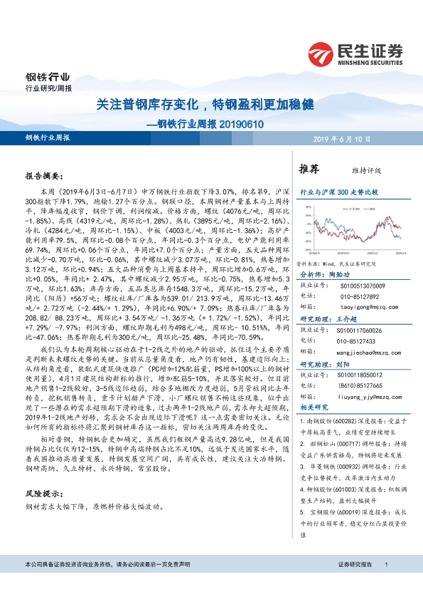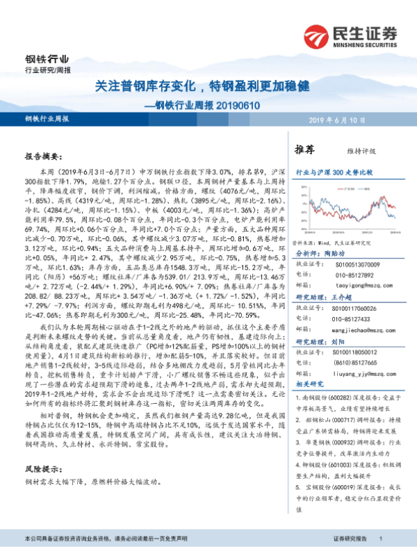 【民生证券】【20190610】20190610-民生证券-钢铁行业周报:关注普钢库存变化,特钢盈利更加稳健-28页