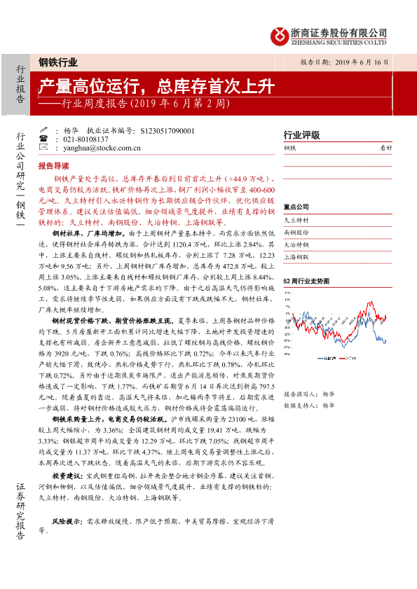 【浙商证券】【20190616】2019年6月第2周钢铁行业周度报告:产量高位运行,总库存首次上升-17页