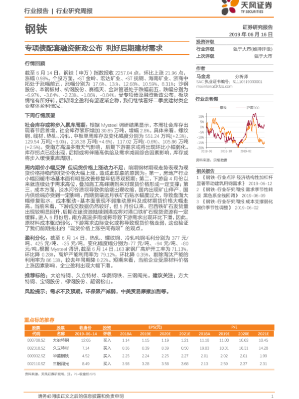 【天风证券】【20190616】20190616-天风证券-钢铁行业研究周报:专项债配套融资新政公布 利好后期建材需求-13页
