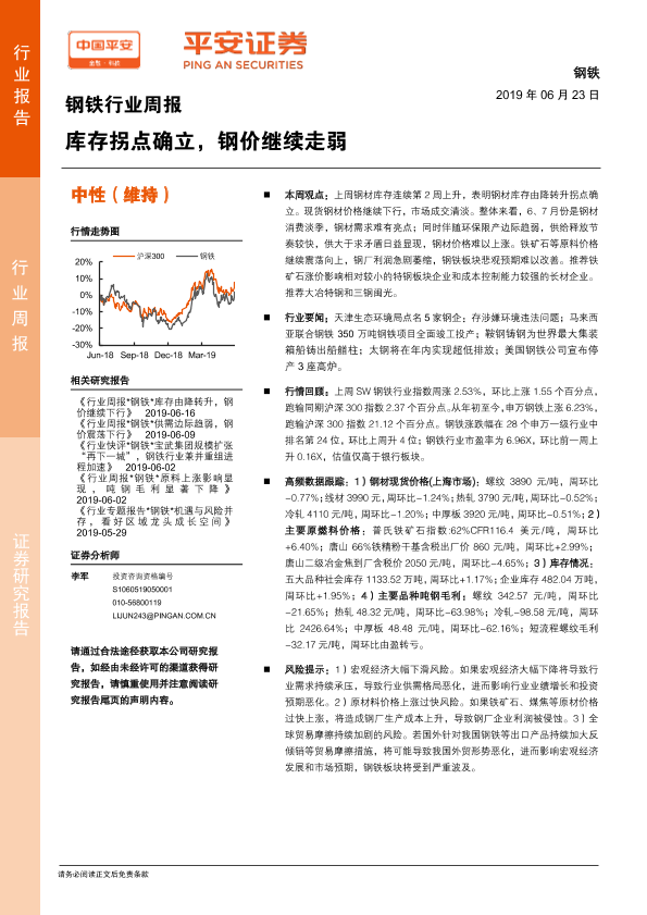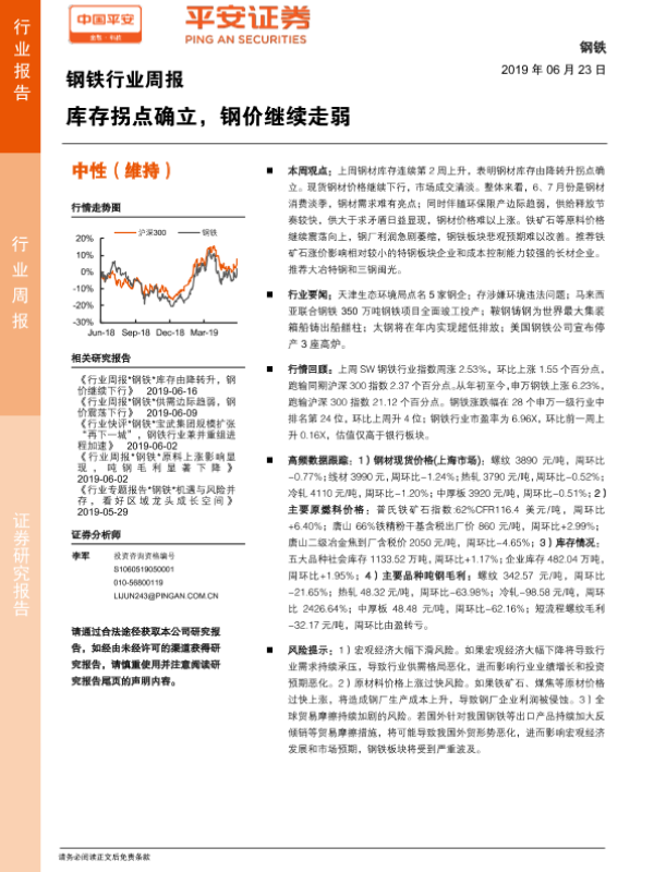 【平安证券】【20190623】钢铁行业周报:库存拐点确立,钢价继续走弱-5页