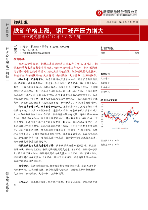 【浙商证券】【20190623】2019年6月第3周钢铁行业周度报告:铁矿价格上涨,钢厂减产压力增大-17页