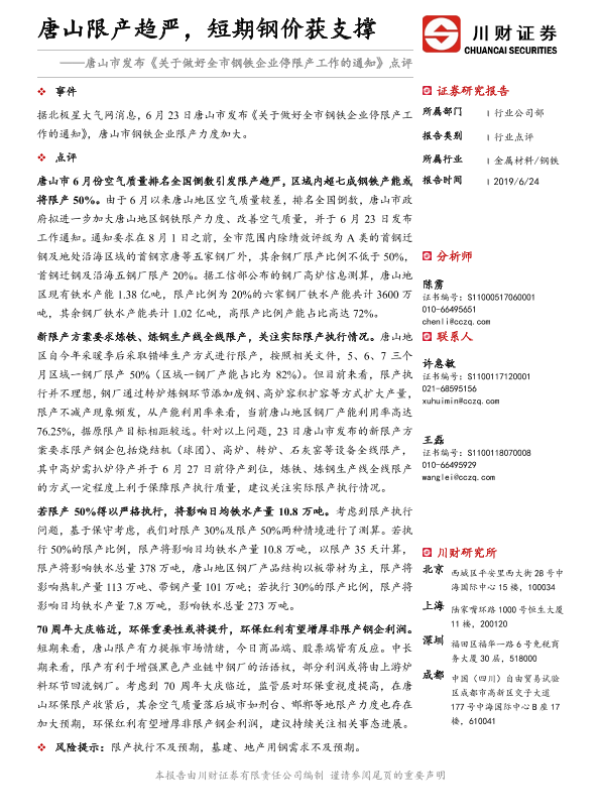 【川财证券】【20190624】唐山市发布《关于做好全市钢铁企业停限产工作的通知》点评:唐山限产趋严,短期钢价获支撑-2页