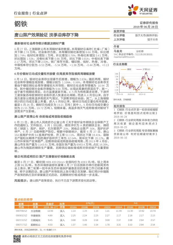 【天风证券】【20190628】钢铁行业点评:唐山限产效果验证 淡季总库存下降-2页