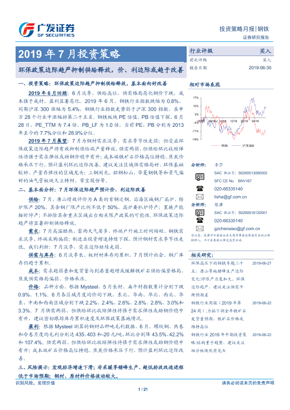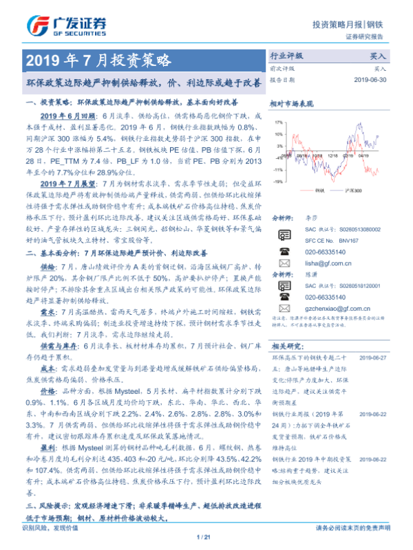 【广发证券】【20190630】2019年7月投资策略:环保政策边际趋严抑制供给释放,价、利边际或趋于改善-21页