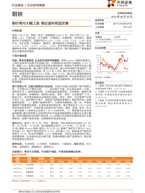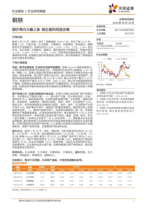 【天风证券】【20190630】20190630-天风证券-钢铁行业研究周报:钢价周内大幅上涨 钢企盈利明显改善-13页