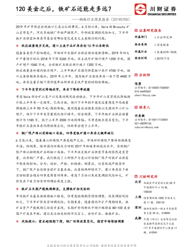 【川财证券】【20190705】20190705-川财证券-钢铁行业深度报告:120美金之后,铁矿石还能走多远?-18页