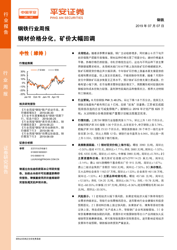 【平安证券】【20190707】20190707-平安证券-钢铁行业周报:钢材价格分化,矿价大幅回调-5页