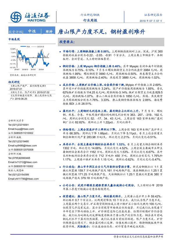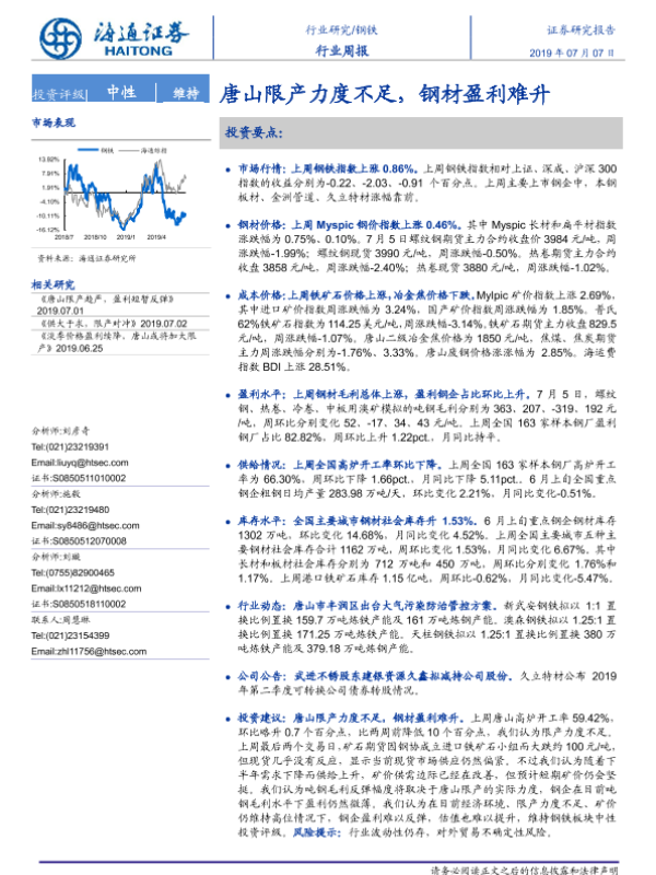 【海通证券】【20190707】20190707-海通证券-钢铁行业周报:唐山限产力度不足,钢材盈利难升-15页