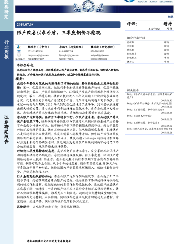 【国泰君安证券】【20190708】20190708-国泰君安-钢铁行业周报:限产改善供求矛盾,三季度钢价不悲观-23页